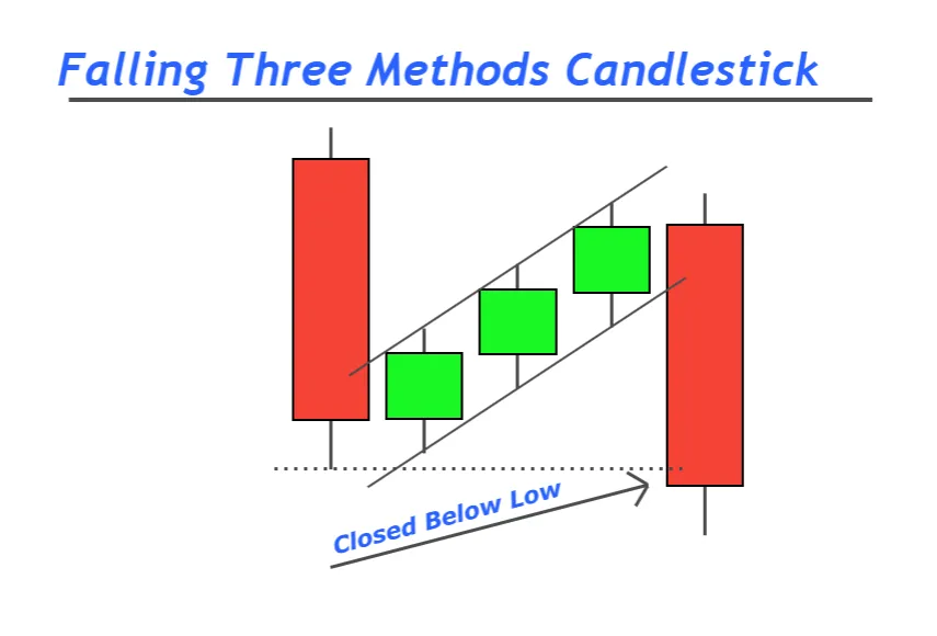 The bearish counterpart to rising three methods, this pattern occurs in downtrends and shows brief buying pressure that cannot sustain against selling momentum. It features a long bearish candle, three smaller bullish candles, and a concluding bearish candle that closes below the initial candle's low.