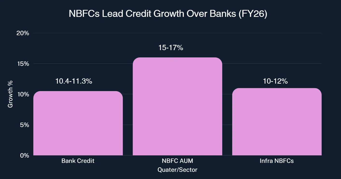 The market share of NBFCs in overall credit has stabilized at approximately 18-19%, reflecting their entrenchment as critical players in credit delivery. For NBFCs excluding infrastructure entities, growth is estimated at 15-17%, while infrastructure-focused NBFCs (NBFC-IFCs) are expected to grow at a healthier 10-12%, supported by government infrastructure spending priorities under the Viksit Bharat Vision 2047.