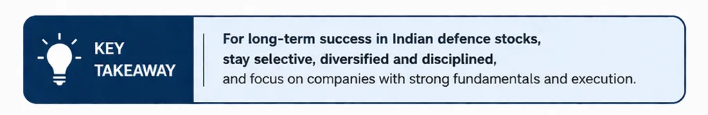 Alt Text: Key takeaway banner stating that long-term success in Indian defence stocks requires selective investing, diversification, discipline, and focusing on companies with strong fundamentals and execution.