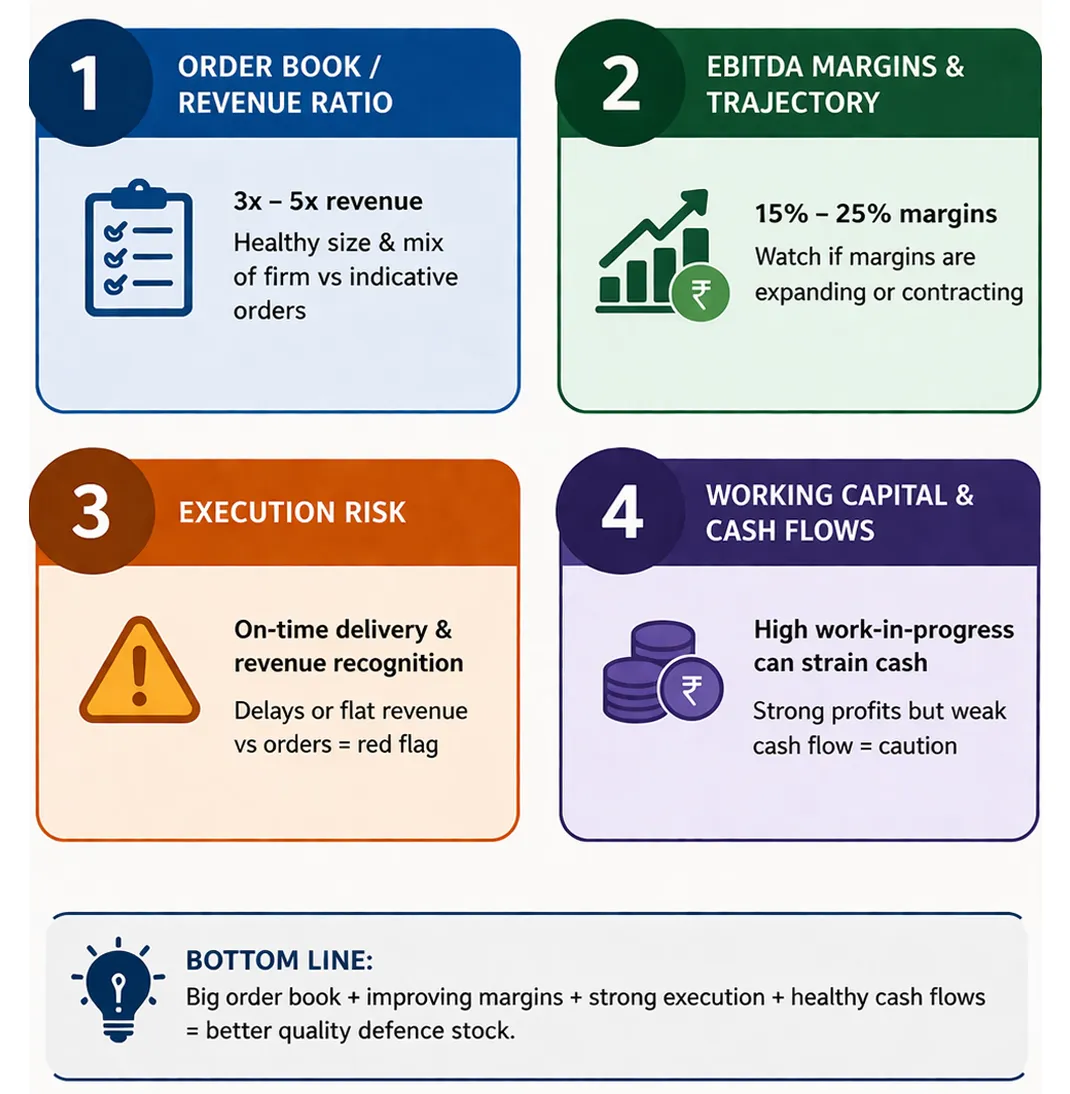 Alt Text: Infographic showing four factors to evaluate defence stocks: order book to revenue ratio, EBITDA margins and trajectory, execution risk in delivery, and working capital and cash flow strength.