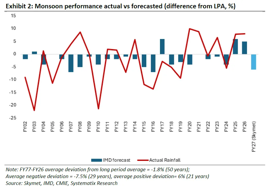 RBI Governor Sanjay Malhotra explicitly flagged the risks in his April policy statement, noting that upside risks to inflation have increased due to energy price pressures and probable weather disturbances affecting food prices. Markets are already pricing in the possibility of rate hikes of up to 50 basis points in FY27. A monsoon-driven surge in food prices would make it significantly harder for the RBI to support growth through rate cuts at a time when GDP growth for FY27 has been estimated at 6.9%, down from 7.6% in FY26.