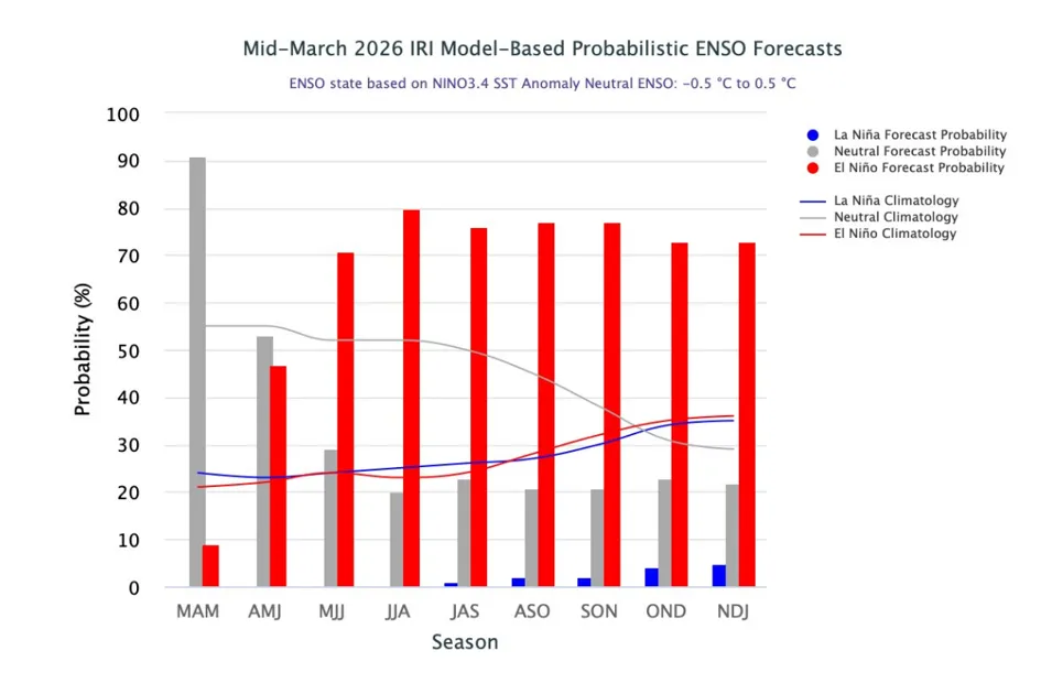 The core reason behind these forecasts is the expected emergence of El Nino conditions. According to NOAA's April 9, 2026 update, ENSO-neutral conditions currently prevail and will likely persist through April to June (80% probability). El Nino is expected to develop during May to July with a 61% probability and persist through the end of 2026. There is roughly a 25% chance of it becoming a very strong event. Other agencies, including the Australian Bureau of Meteorology, the WMO, and Japanese climate models, broadly align with this outlook, confirming a transition from the fading 2025-26 La Nina toward warming Pacific conditions.