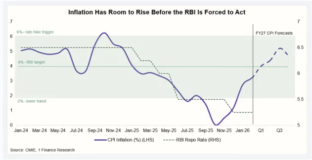 The inflation trajectory has since shifted. CPI inflation rose from 0.71% in November 2025 to 2.7% in January 2026, then 3.2% in February, and 3.4% in March. While these levels remain within the RBI's 2% to 6% tolerance band, the direction is upward. The RBI has projected CPI inflation for FY27 at 4.6%, with a quarterly breakdown of 4.0% in Q1, 4.4% in Q2, 5.2% in Q3, and 4.7% in Q4. The Q3 spike, coinciding with the post-monsoon period, reflects anticipated food price pressures.