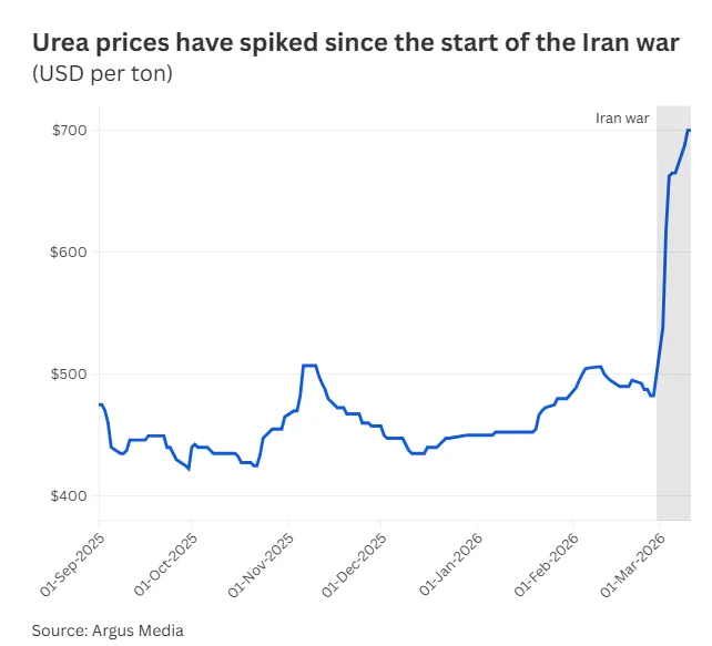 The price impact has been sharp and rapid. Urea prices at major import hubs surged from roughly $516 to over $680 per tonne within days. Ammonia climbed from about $495 to $600 per tonne. Phosphate prices crossed $700 per tonne. According to Oxford Economics, urea and ammonia prices have risen by approximately 50% and 20% respectively since the conflict began. Global urea futures reached $693 per ton, up 49% from pre-war levels, according to CSIS data.