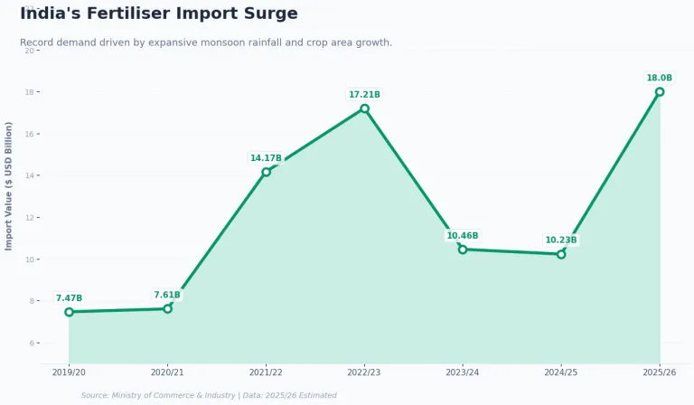 The government's Nutrient-Based Subsidy for Kharif 2026 has already been raised to Rs 41,534 crore, an 11 to 12% increase, which is Rs 4,317 crore higher than Kharif 2025. If global prices remain elevated and monsoon deficiency reduces domestic demand further, the subsidy burden could swell by an additional Rs 10,000 to 25,000 crore in FY27.