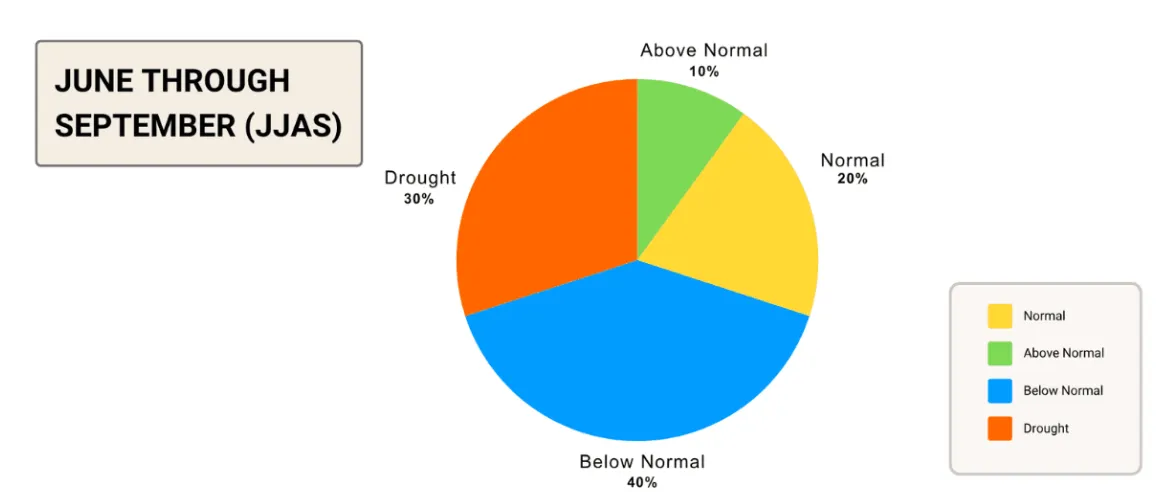 Skymet's probability breakdown is similarly weighted toward the downside: a 30% chance of drought (below 90% of LPA), 40% chance of below-normal rainfall, 20% chance of normal, and only 10% chance of above-normal. The probability of excess rainfall is zero.