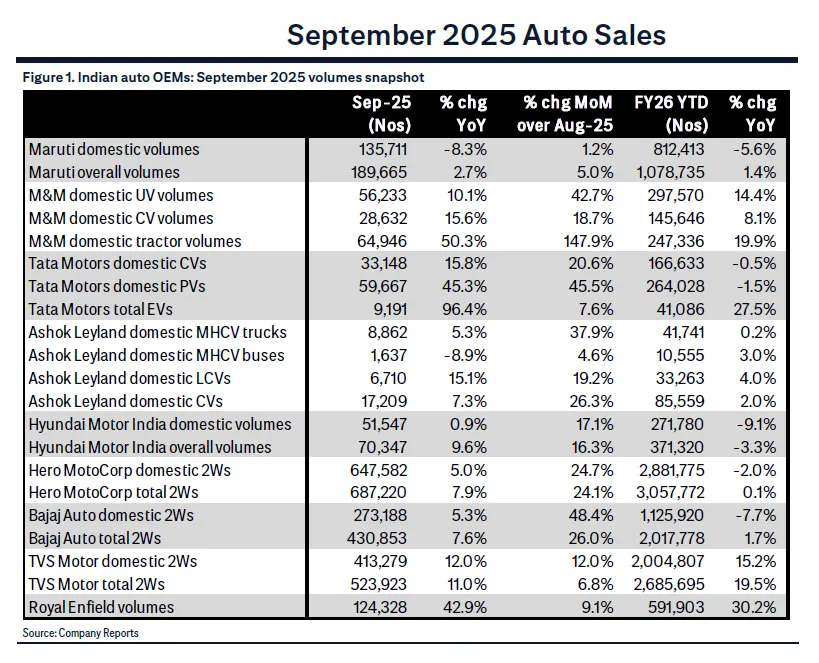 Mahindra & Mahindra: 56,233 wholesales, +10.1% y/y, with SUV-led strength and dealer-reported retails in the first nine days of Navratri >60% higher than last year’s comparable period.