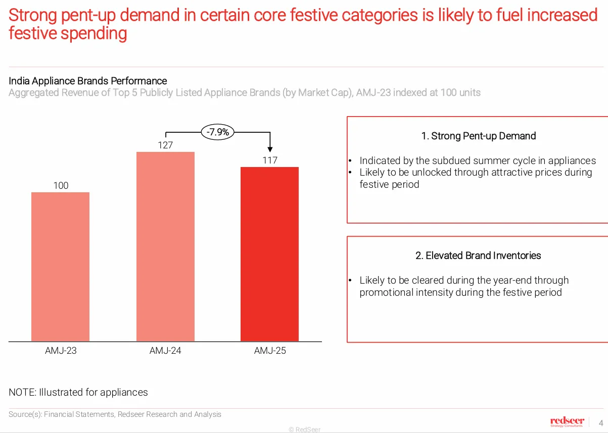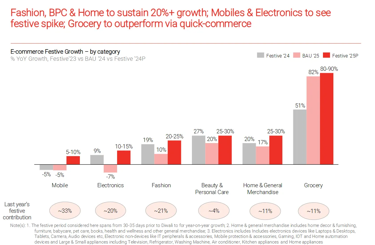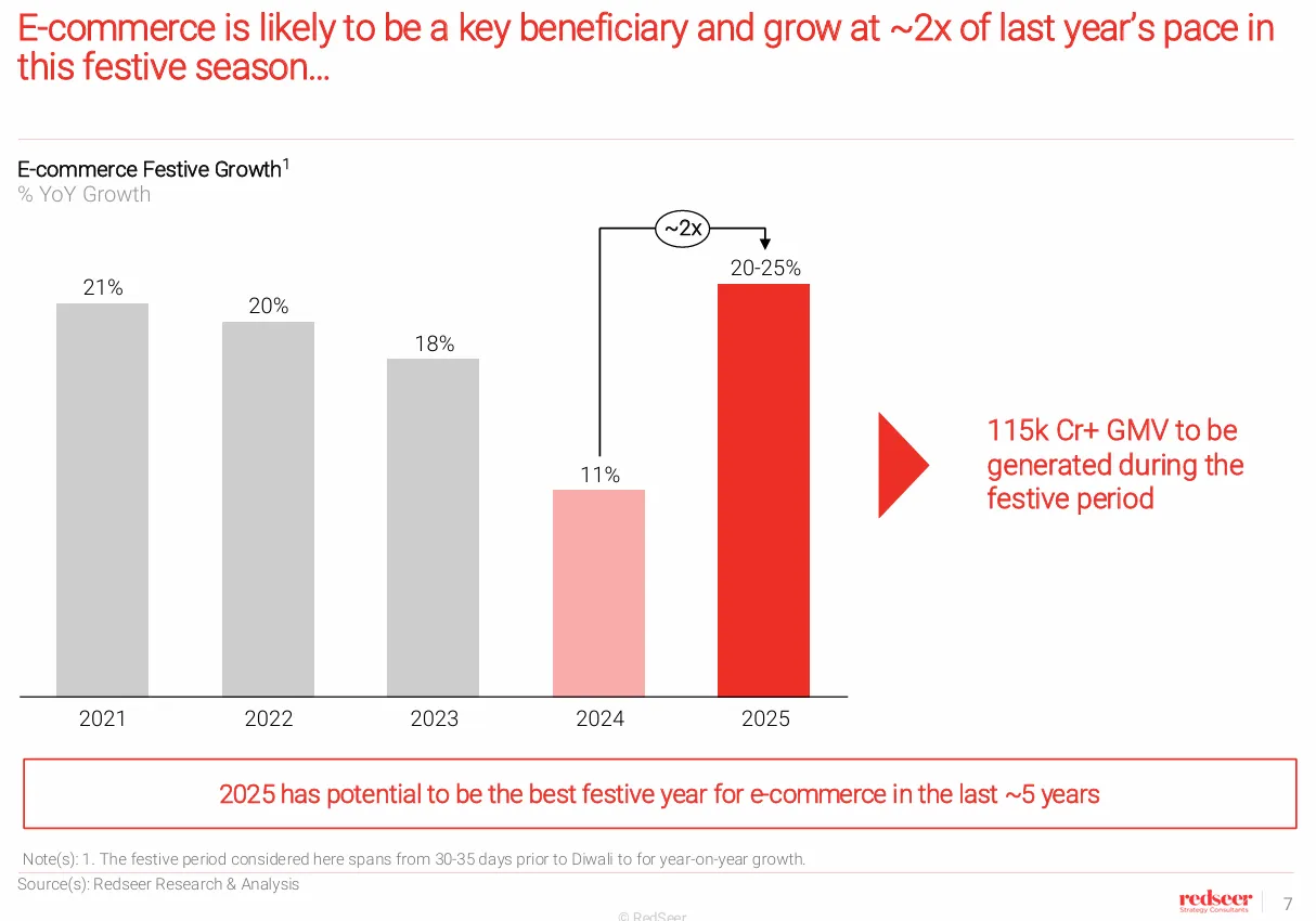 Value commerce keeps humming: A price-sensitive cohort is pushing value formats, which Redseer sees growing 40–50% YoY this season. That supports steady 20%+ growth in categories like fashion and home.