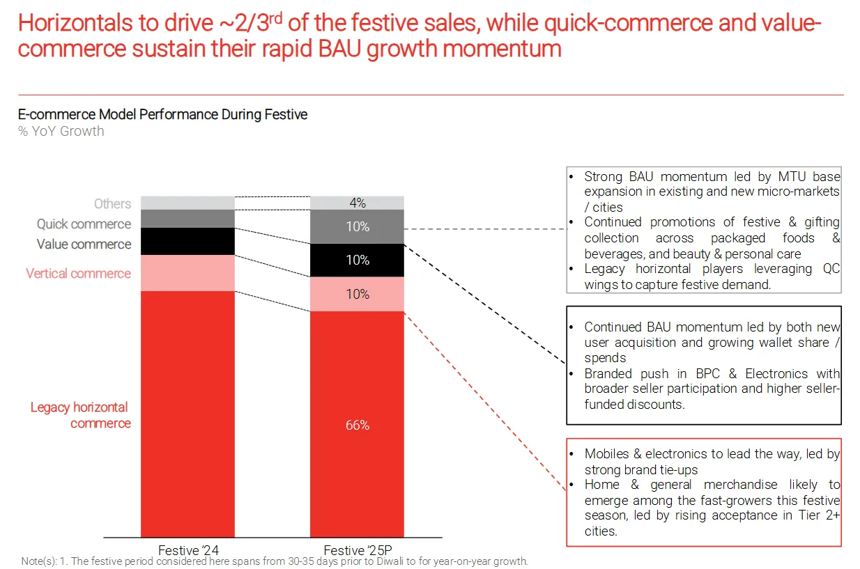 Legacy horizontals still dominate: Despite the rise of vertical, value and quick-commerce players, legacy horizontal marketplaces are still projected to drive roughly two-thirds of festive sales.