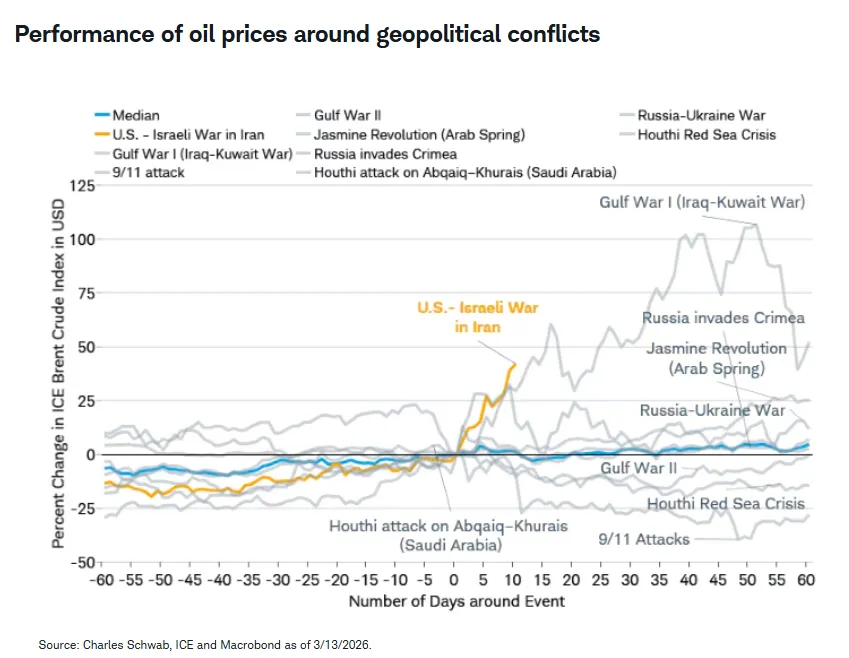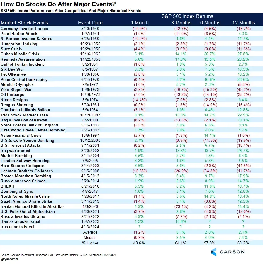 Across 40 major geopolitical events spanning 85 years, the S&P 500 has lost an average of 0.9% in the first month but recovered to gain 3.4% over the subsequent six months.
