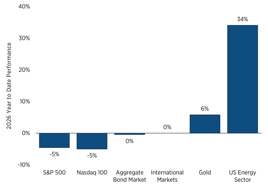 The problem for traditional portfolios is that when inflation is the primary risk, stocks and bonds can decline together, eliminating the diversification benefit that 60/40 allocations are designed to provide. During one session in late March, the S&P 500, Treasury bonds, and gold all fell simultaneously, a correlation breakdown that exposed the limits of conventional portfolio construction after 15 years of tech-driven returns.