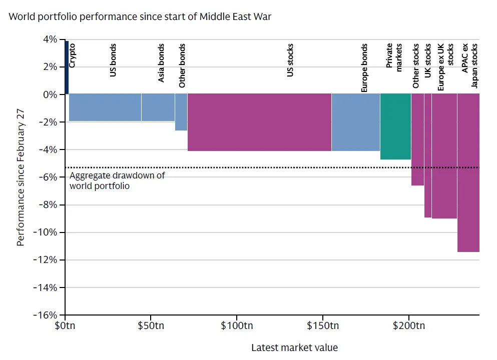 Stock markets have declined but not collapsed. The S&P 500 logged its worst single day since the war began in mid-March, and the Nasdaq 100 entered correction territory. However, the aggregate drawdown of the global investable portfolio, estimated at $300 trillion across all asset classes has been approximately -5% since the start of the conflict. For a standard 60/40 portfolio (60% S&P 500 equities, 40% 10-year U.S. Treasury bonds), losses have been described by analysts as relatively modest compared to the 2022 drawdown.