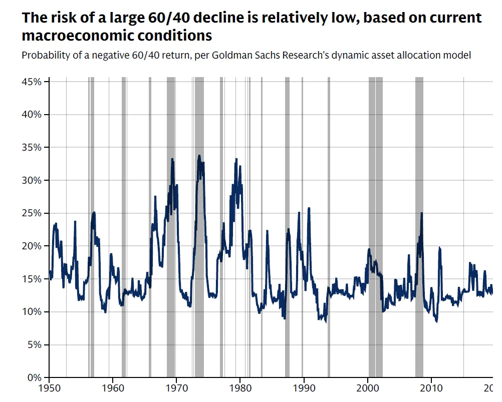 The baseline expectation among major investment banks is that markets will eventually recover. The probability of a sustained 60/40 decline remains relatively low by historical standards because growth, while downgraded, has not collapsed, inflation has not become fully unanchored, and policy easing continues. Machine-learning models tracking the likelihood of negative 12-month 60/40 returns remain at moderate levels.
