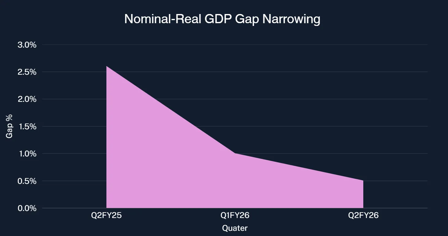 Perhaps the most intriguing aspect of India's Q2 FY26 performance is the remarkably narrow gap between nominal GDP growth (8.7%) and real GDP growth (8.2%) just 0.5 percentage points. This represents the smallest divergence since Q3 FY20 and signals profound deflationary pressures pervading the Indian economy. Historically, inflation creates a 3-4 percentage point gap between nominal and real GDP growth; the current gap is highly unusual and warrants careful interpretation.