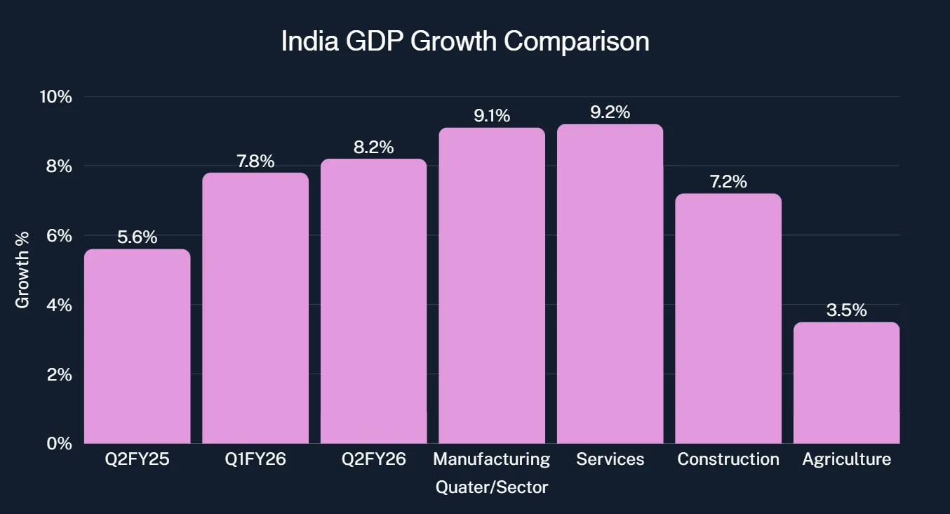 India's second quarter real GDP growth of 8.2% represents a decisive departure from earlier slowdown fears. This performance is particularly noteworthy because it emerged from a weak base of just 5.6% recorded in Q2 FY25, yet it still comfortably surpassed even the most optimistic market expectations. The growth trajectory has shown remarkable consistency across the first half of FY26, with real GDP expanding at 8.0% during April-September 2025, a significant improvement from the 6.1% recorded during the same period in FY25.