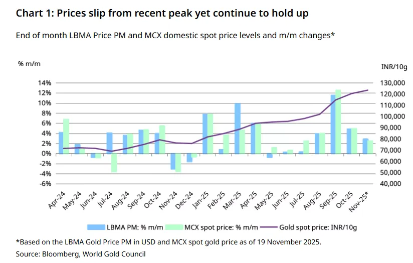 The 2025 wedding season is taking place against the backdrop of an extraordinary multi-year rally in gold. World Gold Council notes that the average domestic Indian gold price jumped by about 46% year-on-year, from roughly ₹66,600 per 10 grams in the third quarter of 2024 to around ₹97,000 per 10 grams in the third quarter of 2025.