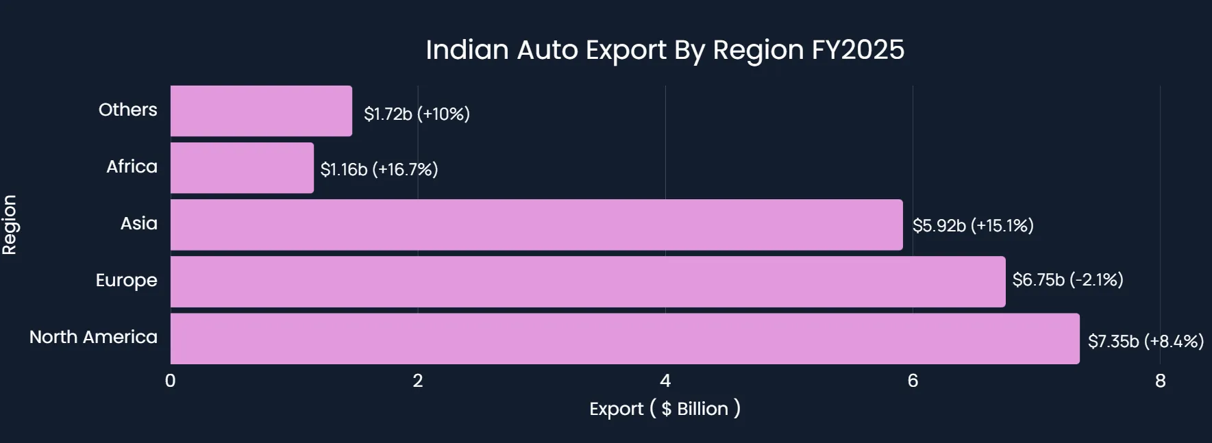Asia has emerged as the sector's fastest-growing market, with exports surging 15.1% to USD 5.92 billion, representing 26% of total shipments. This strong Asian performance reflects India's growing competitiveness in regional automotive supply chains, particularly in drivetrain components, transmission systems, and emerging EV-related parts. Vietnam, Indonesia, and Thailand represent emerging opportunities in the ASEAN region, where India is increasingly preferred as a geopolitically diversified alternative to Chinese suppliers.