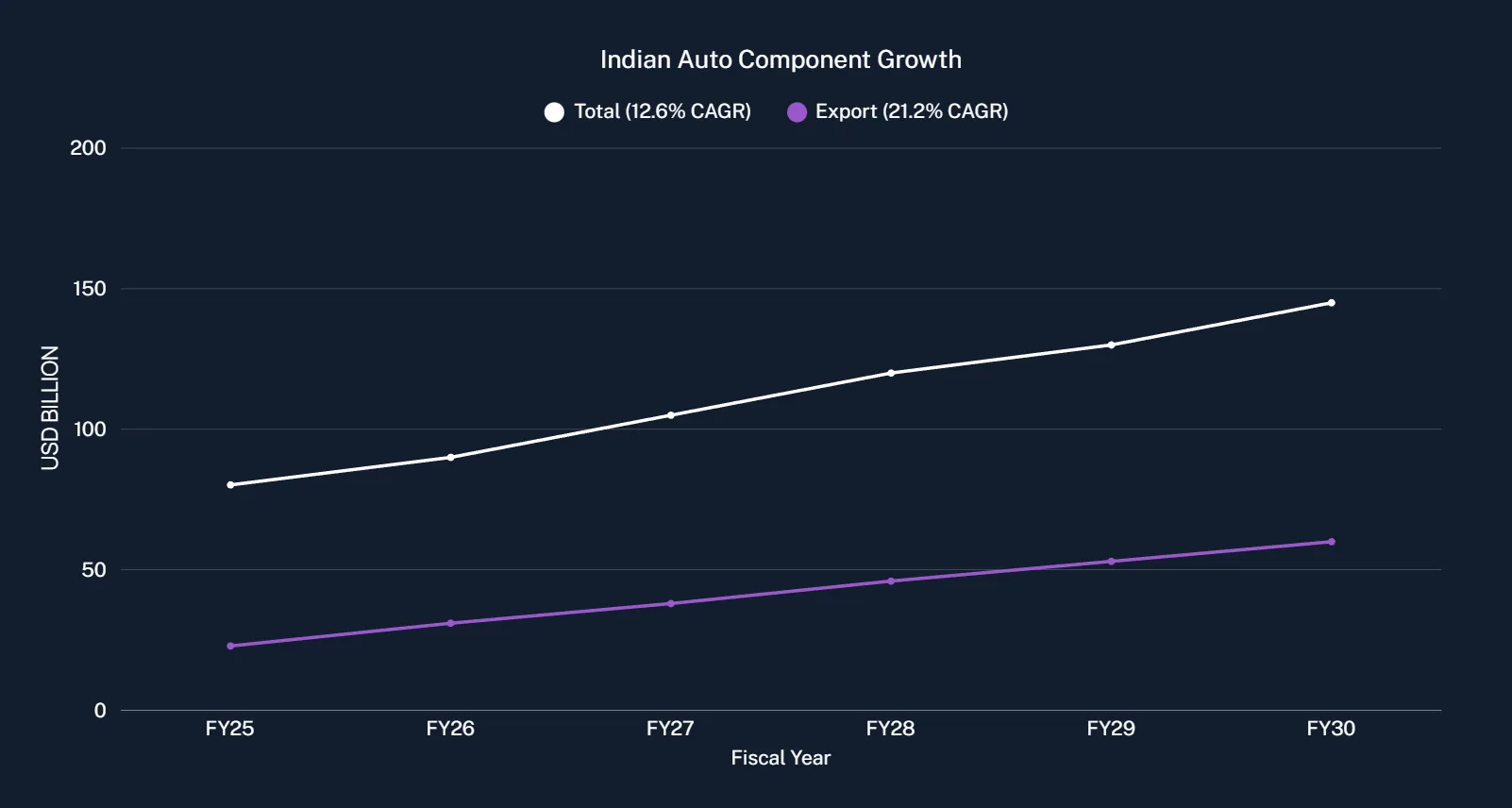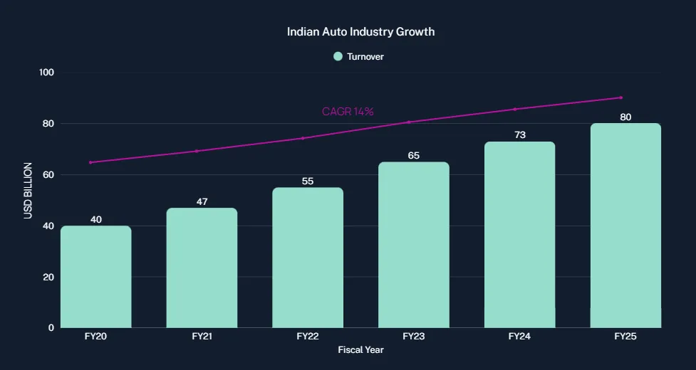The Indian auto component industry has demonstrated extraordinary growth momentum over the past five years. From an estimated USD 40 billion in FY20, the sector has nearly doubled in size to reach USD 80.2 billion in FY25, achieving an impressive 14% compound annual growth rate (CAGR). This growth trajectory reflects not just recovery but fundamental structural strengthening of the industry's manufacturing capabilities and competitive positioning.