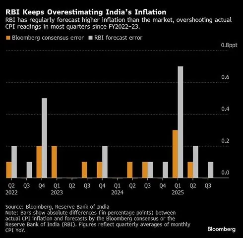 Reserve Bank of India’s inflation-forecasting model is under growing scrutiny because it has repeatedly overestimated price pressures through 2025, pushing policy into a more hawkish stance than the data ultimately justified. In the first three months of the year, the RBI’s inflation projections overshot actual outcomes by about 0.7 percentage points – its biggest miss in nearly six years – with smaller but still notable errors of 0.2 and 0.1 points in the next two quarters. Economists now expect another sizable miss after the surprisingly soft October inflation print, which has already rendered the RBI’s recent forecast of 2.6% inflation for the fiscal year through March outdated; private estimates cluster closer to 2.0–2.2%, near historic lows, versus the central bank’s 4% target.