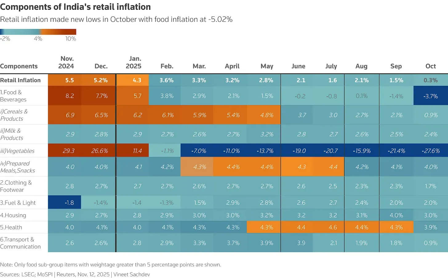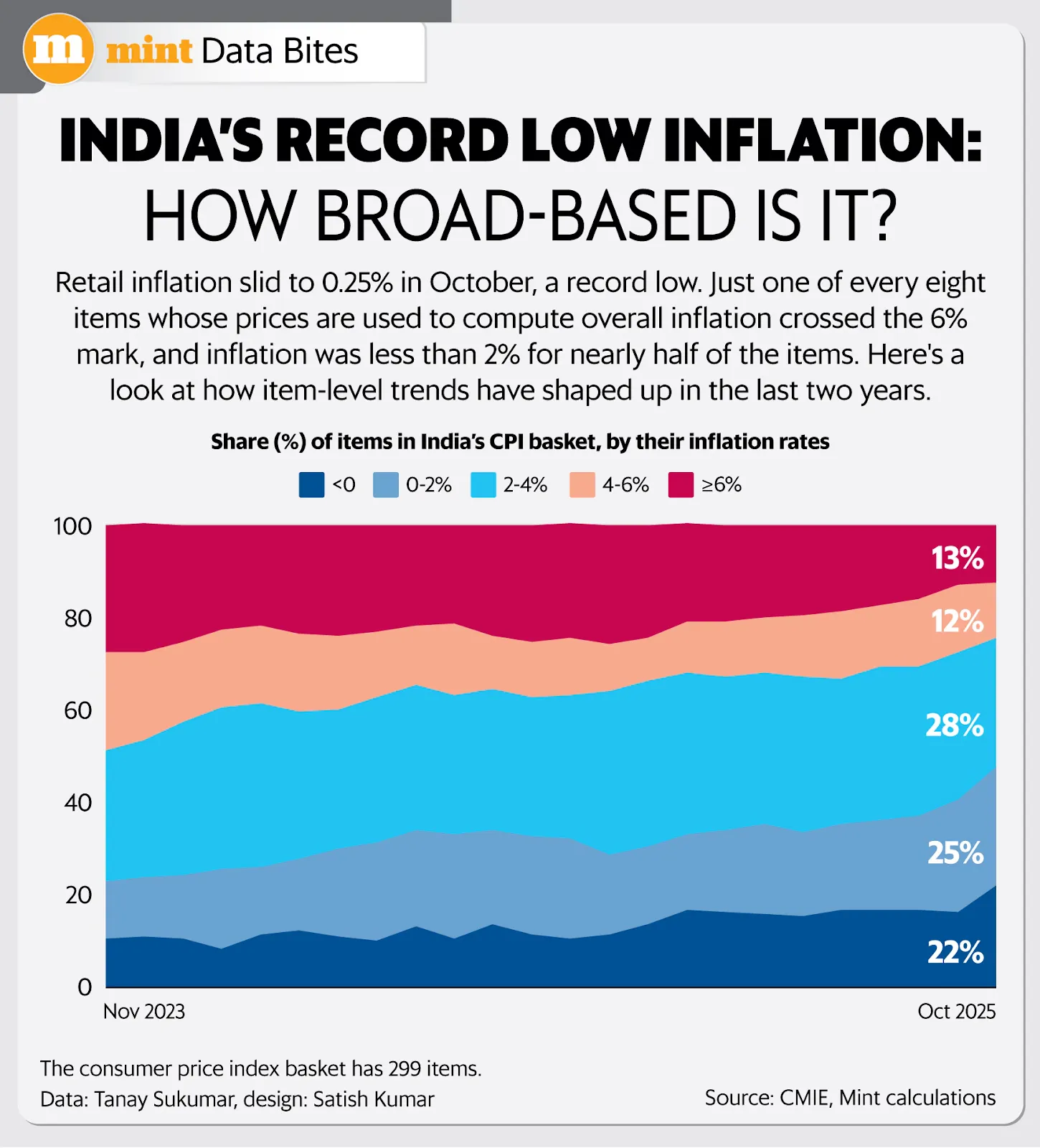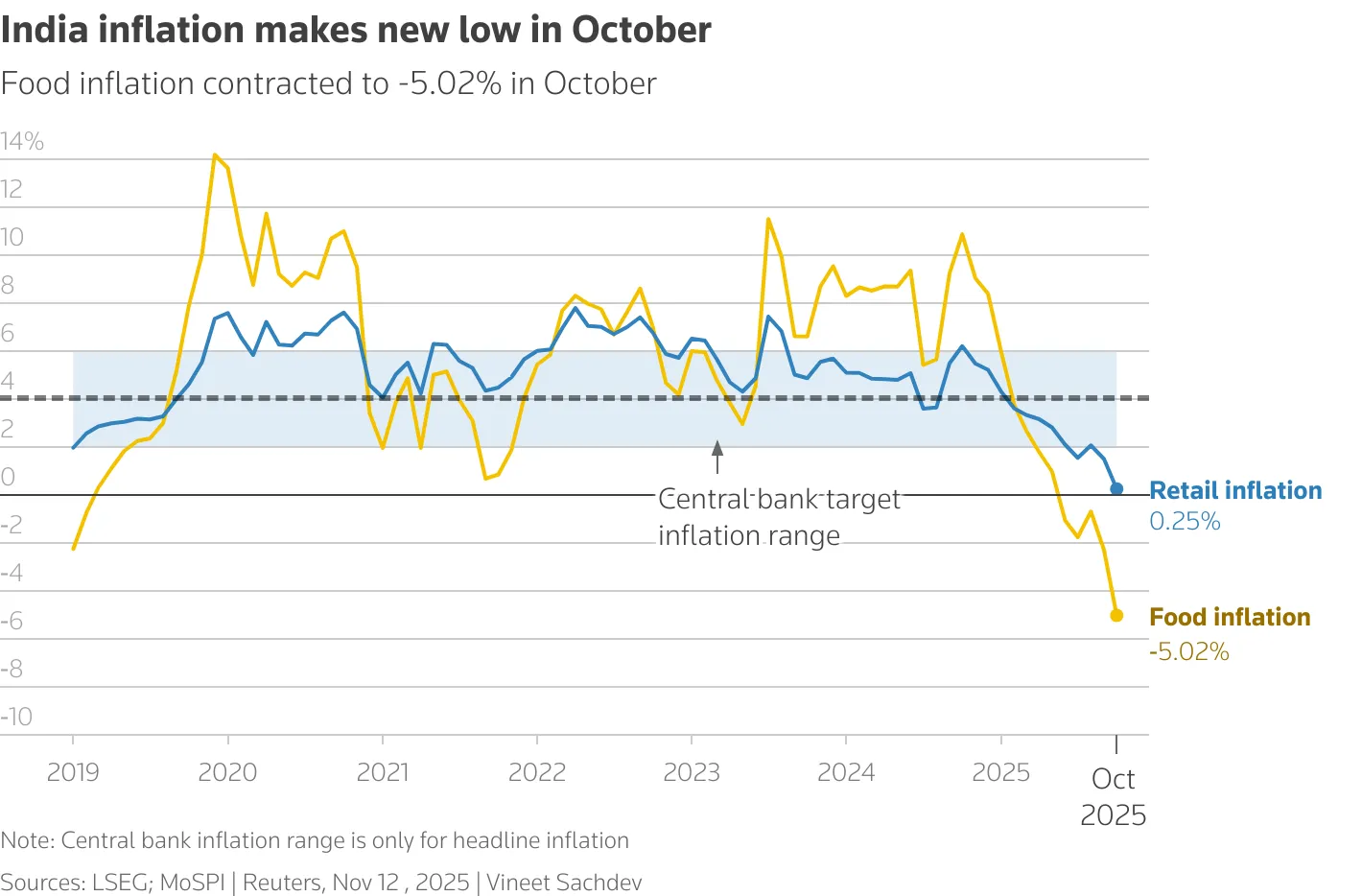 India is living through an inflation moment that would have sounded implausible a few years ago. Retail inflation based on the Consumer Price Index (CPI) crashed to just 0.25% in October 2025, the lowest print since the current CPI series began in 2013. This comes barely a year after inflation was above 6%, breaching the RBI’s tolerance band of 2–6%.