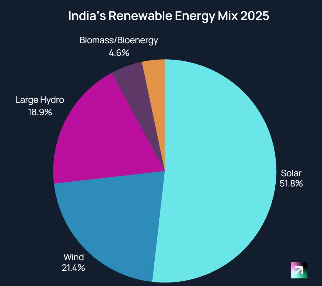 The momentum of renewable energy deployment in 2025 has been unprecedented. In the first half of the year alone, India added 22 GW of renewable capacity, comprising 18.4 GW of solar, 3.5 GW of wind, and 250 MW of bioenergy. This marked the country's highest-ever capacity addition in any six-month period, driven largely by developers rushing to capitalize on the government's Interstate Transmission System (ISTS) charge waiver, which begins at 25% and increases annually until full implementation by June 2028.