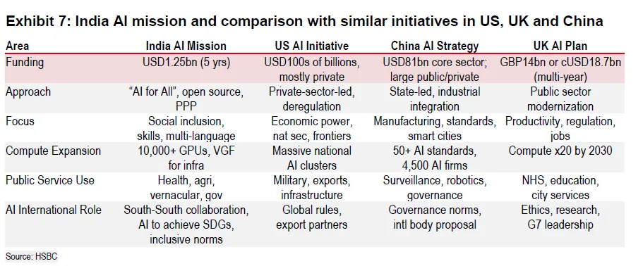 India’s own AI capex is modest. The IndiaAI Mission targets ~USD 1.25bn over 2024 to 2029. This is but a rounding error beside the hundreds of billions in the US (mostly private) and large state-led pushes in China and substantial public plans in the UK.