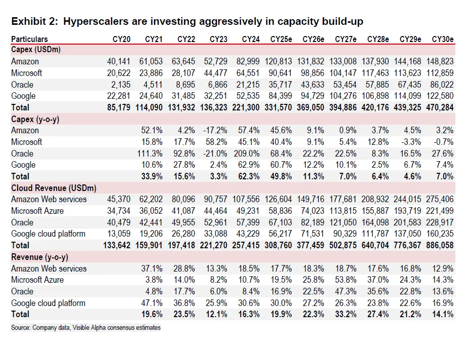 The global AI build-out is not small: top hyperscalers’ capex could sum to about USD2 trillion over five years, with annual spend around USD300bn in 2025 and trending toward USD500bn by 2030; associated depreciation could reach ~USD300bn by 2030, implying a very large revenue base inside the platforms most able to internalize software productivity. Historically, each USD of upstream software has created multiple USD of downstream services demand (3–6x in prior eras), but even a 0.5–1.0x multiplier in AI would still be material for services vendors if they win the work.
