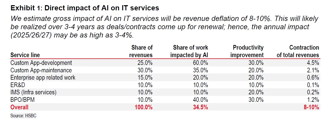 At the heart of the “anti-AI” framing is the deflationary effect of agentic and generative AI on labor-intensive IT services. There is, however, a nearer-term sting. As AI tools permeate the delivery stack, Indian IT services revenues face 8 to 10% deflation spread over 3 to 4 years as contracts reprice to AI-enabled productivity, implying 3–4% annual headwinds over 2025–27. That deflation is cyclical (contract reset) and technological (automation), and it disproportionately hits application development/ maintenance and BPO which are precisely the bread-and-butter service lines where India has global share.