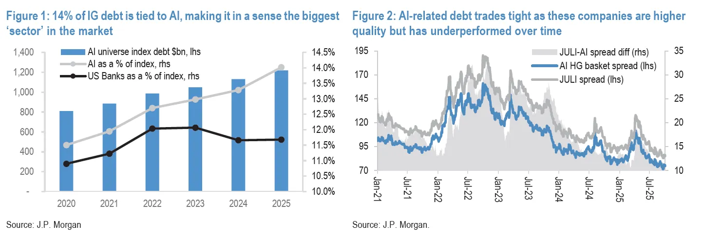 Credit tells a different story with investments in AI no longer being niche. USD 1.2 trillion of investment-grade debt now sits with companies most tightly tied to AI, taking the “AI cohort” to 14% of the investment grade (IG) index which is bigger than U.S. banks at 11.7% in that index. Yet this debt still trades like quality.Spreads on this AI basket trade around 74 bps, roughly 10 bps tighter than the broad index, and notably outperformed in the Q2-2025 selloff—consistent with high-quality balance sheets.