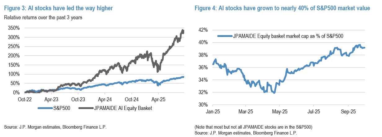 AI has been the dominant engine of U.S. equity performance since 2022, driven by a small cohort of companies whose weight and fundamentals far outpaced the rest of the market. A 30-stock AI group swelled to about 43% of S&P 500 market cap and accounted for >70% of the index’s performance contribution (ex-NVDA), with 31% cumulative sales growth versus 8% for non-AI peers and margin expansion from 17.3% → 25.2% (ex-AI margins drifted 11.4% → 11.1%). This leadership concentrates global equity beta into AI, amplifying the opportunity cost for investors underweight the theme. And in the absence of AI linked growth, performance of certain indices such as S&P 500 and earnings momentum would look materially weaker.