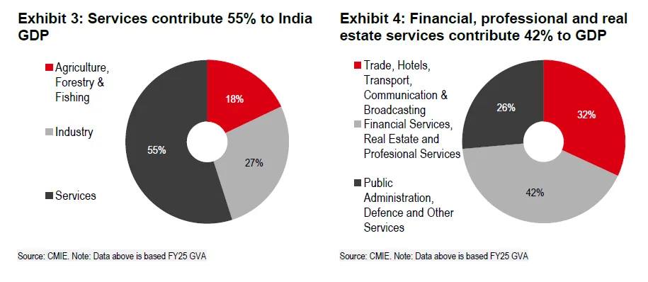 At the macro level, services are 55% of India’s GVA, substantially above the global average, so a technology that substitutes or augments knowledge work is macro-sensitive. Financial, professional, and real estate services alone contribute ~42% to the services sector. And are ripe to amplify AI’s effect on white-collar employment and wage dynamics relative to global averages.