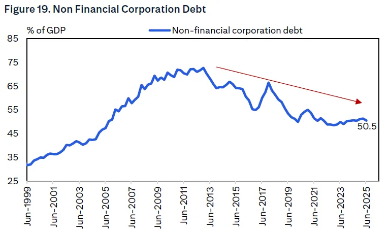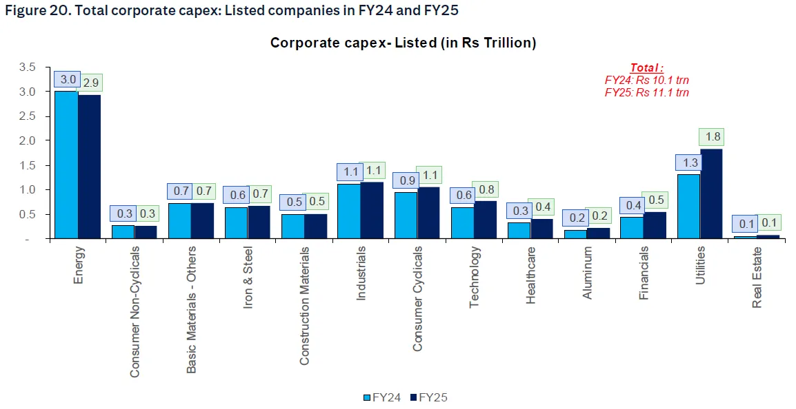 Corporate balance sheets today are cleaner than in the 2005 to 2010 boom - deleveraged, with better cash flows and lower legacy stress. Post-COVID, corporate capex has rebounded strongly (listed +24% in FY24), then cooled to +10% in FY25 - energy, consumer, and basic materials slowed, while utilities and real estate held up.