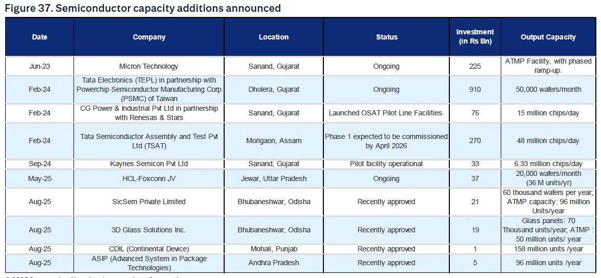 Since the launch of the India Semiconductor Mission (₹760 billion PLI envelope), approvals have accelerated. As of August 2025, 10 semiconductor projects have been approved, with an expected capital outlay of ~₹1.6 trillion spanning a mix of fabs, OSAT/ATMP, and component ecosystems.