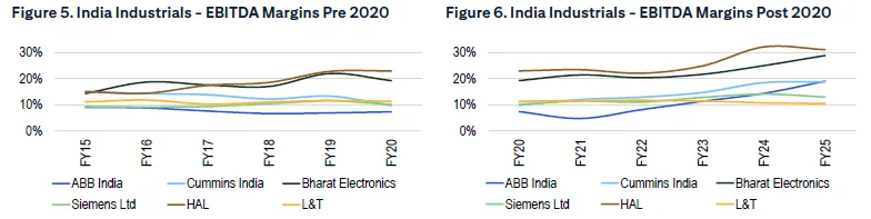 That shift has already shown up in capital goods margins—leaders have expanded EBITDA through mix upgrades (data-centre power, automation), localisation, export scale from Indian plants, and operating leverage on multi-year volume growth.