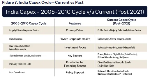 The last big capex wave (pre-GFC) was a debt-heavy, private-sector boom, concentrated in commodity and real-estate capacity. It ended with deleveraging and a long investment drought. The post-2021 cycle is different: it began with public capex doing the heavy lifting—providing visible demand while corporate balance sheets healed—and it is moving into higher-tech, productivity-enhancing assets (smart grids, high-speed and urban transit, electronics, defence electronics, digital infrastructure). Today, the state leads with infrastructure capex, corporate balance sheets are healthier, and spending is skewed toward productivity and tech content—smart grids over just transformers; high-speed systems over basic rail. That shift supports both margins and export competitiveness over time, as local supply chains climb the value curve.