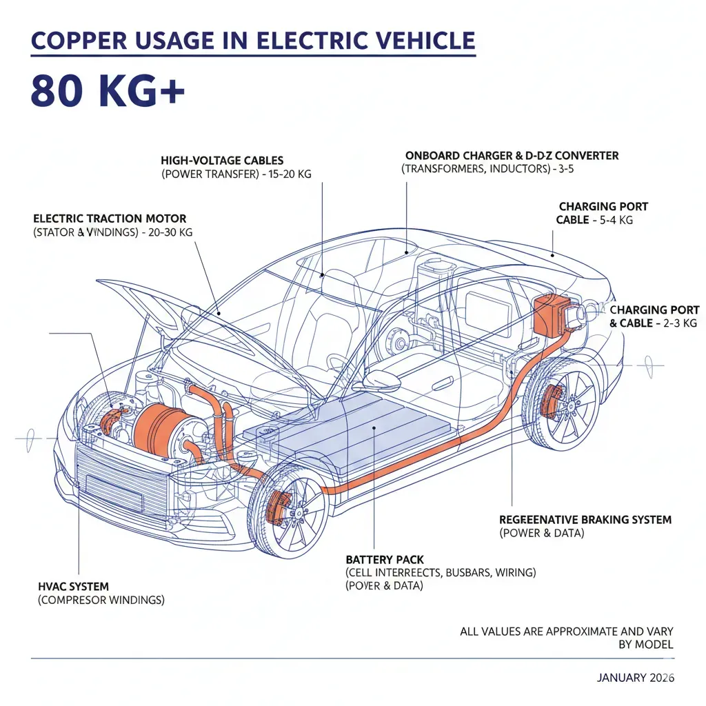 Electrification is the first engine, and it’s copper-heavy by design. A typical EV uses ~80–90 kg of copper, roughly 4× a conventional car,before you add chargers and grid upgrades that make EV adoption possible. This isn’t a one-off bump: every percentage point of EV penetration multiplies into copper demand across charging networks, substations, and distribution upgrades.