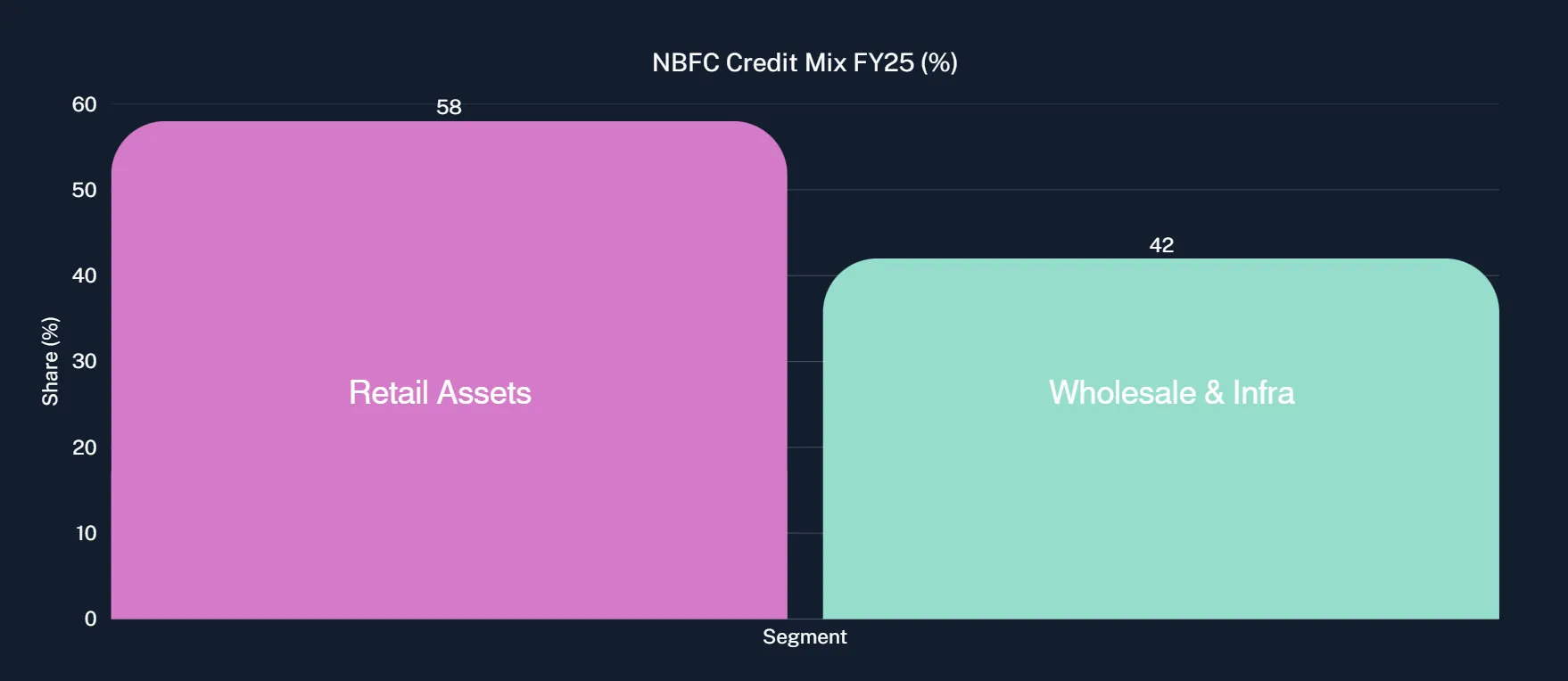 The transformation of India's NBFC sector in FY25 is fundamentally defined by one phenomenon: the explosive growth of retail credit. Retail assets now constitute 58% of total NBFC lending as of December 2024, representing a historic pivot from wholesale-dominated lending models. This represents not merely a sectoral shift, but a fundamental reimagining of how NBFCs deploy capital from infrastructure and industrial financing toward personal loans, vehicle finance, microfinance, and consumer durables.