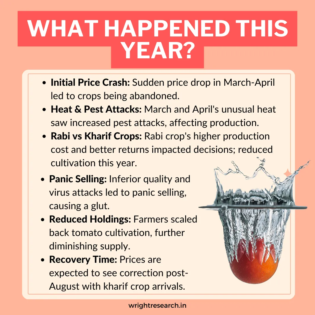In March-April, the market faced a glut due to overproduction and farmers resorting to panic selling. This was exacerbated by the presence of inferior quality crops and a collapse in prices. Consequently, many farmers abandoned their crops following a price crash. Some farmers also reduced their tomato holding, with certain regions reporting significantly lower rabi tomato cultivation compared to previous years. As the year progressed, excessive heat and attacks by leaf curl and cucumber viruses devastated the crops in South India and Maharashtra, leading to inferior quality and a decrease in production. The rabi crop also fetches better returns, but the price collapse forced farmers to sell at much lower rates. This led to a significant reduction in plantation and an eventual rise in prices.