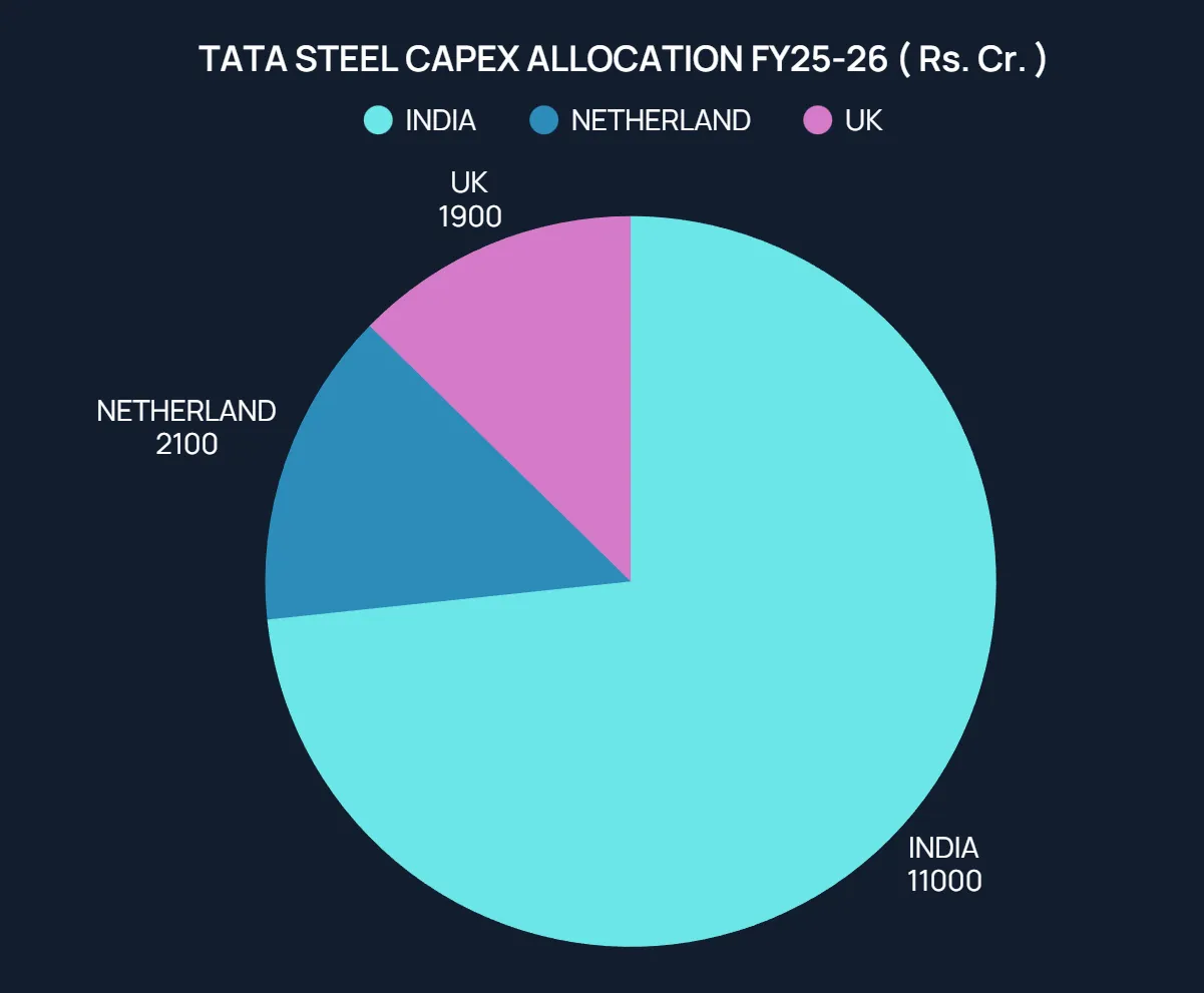 Tata Steel has committed ₹15,000 crore in capital expenditure for fiscal year 2025-26, with ₹11,000 crore (73.3 percent) directed toward Indian operations. Of this India capex, the majority will support the Kalinganagar 5 MTPA blast furnace expansion and the foundational work for the other expansion projects. An additional ₹1,900 crore will fund UK operations, primarily the Port Talbot electric arc furnace project that will transition the company away from coal-intensive blast furnace steelmaking. The remaining ₹2,100 crore targets Netherlands operations at IJmuiden.