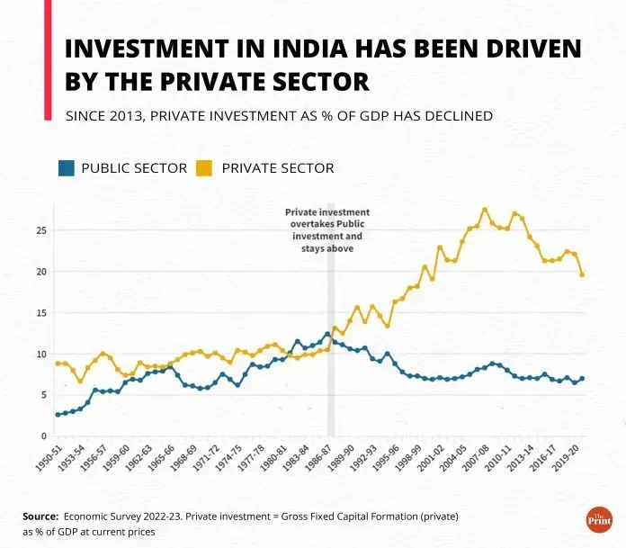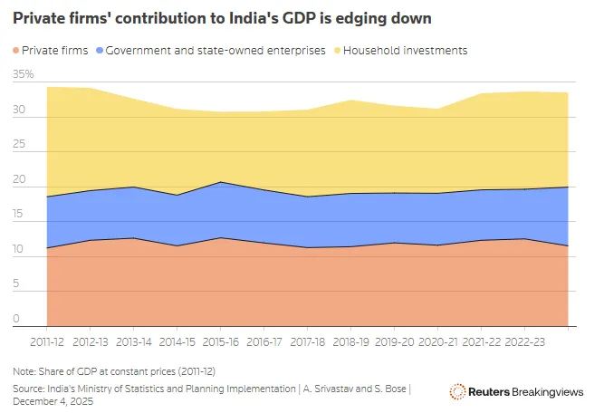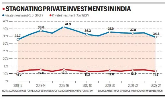 The private sector’s share of total fixed investment has shrunk from over 40% in 2015–16 to about 33% in 2023–24, implying that even when the overall investment pie grows, the private slice has not kept pace.
