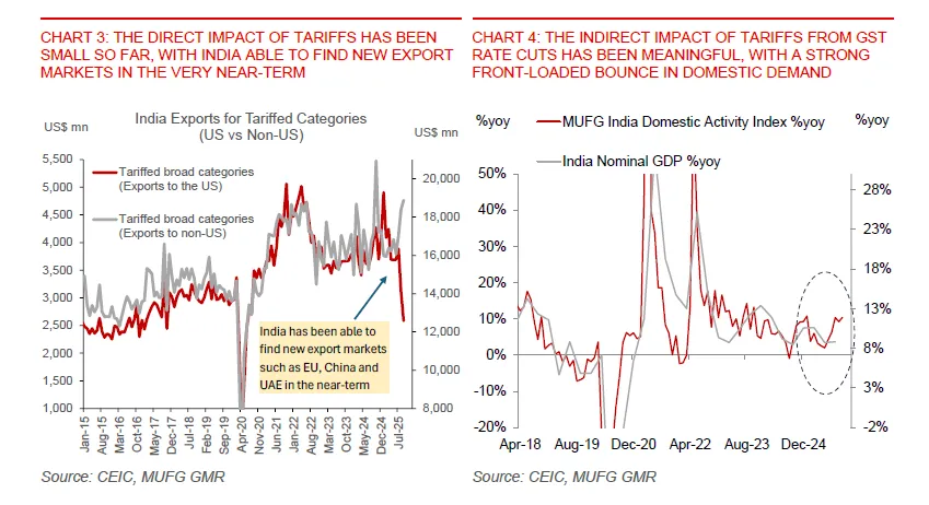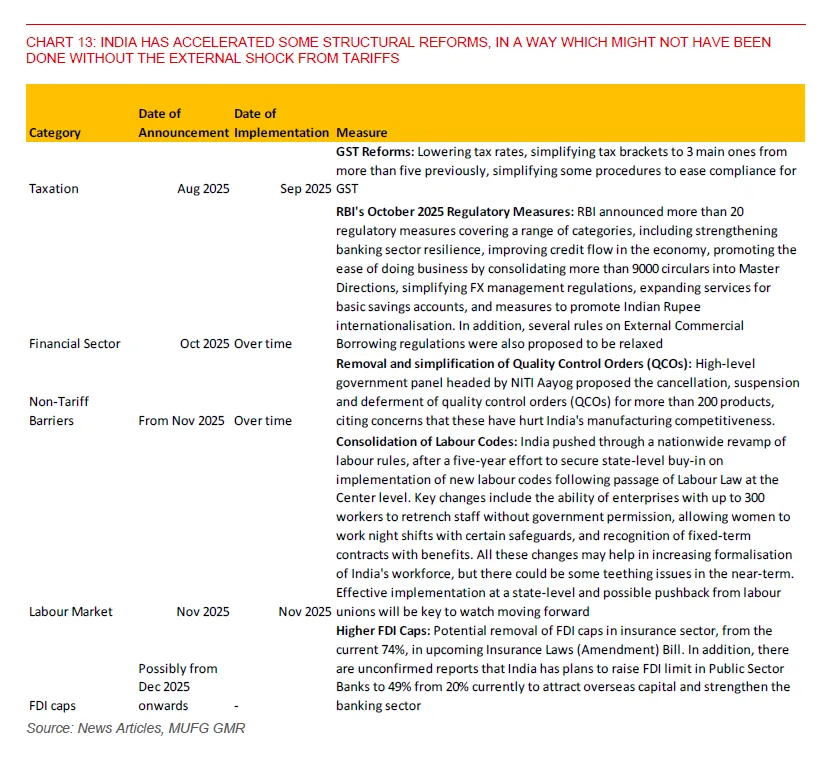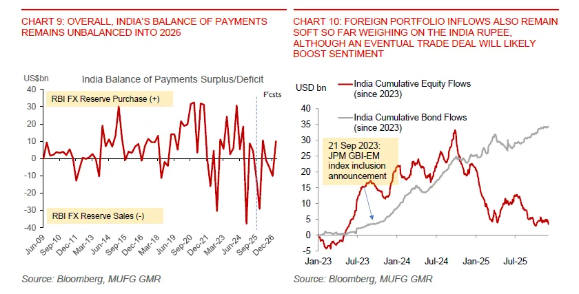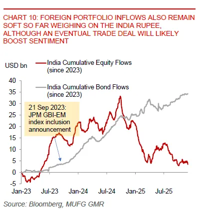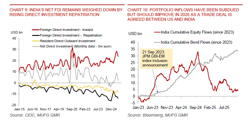 Put together, these reforms point to an economy that is using this period of FX and trade tension to tackle long-standing bottlenecks. In the near term, the price of that adjustment is a somewhat weaker rupee, especially given the widened current account deficit and softer net FDI. India enters this phase with growth running above 7%, inflation temporarily very low, FX valuations already cheap on a real-effective basis and a reform agenda that could lift productivity and attract new capital over time.