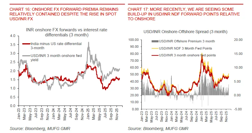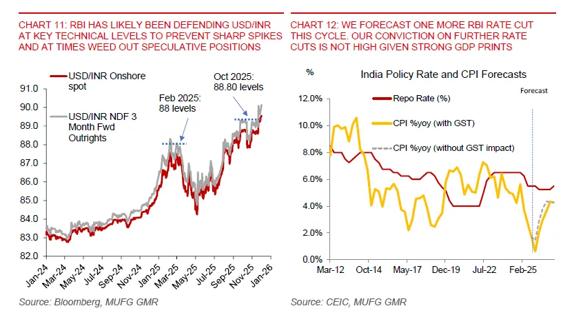 That is where the central bank’s FX operations come in. RBI likely sold more than 25 billion dollars in FX reserves between October and December to resist rupee weakness, and that its net short forward position reached about 64 billion dollars by October 2025. The charts show a clear pattern of negative reserve changes and rising net short forward positions at times when USD/INR approached or broke through key levels, such as 88 and then 88.80 earlier in 2025. The message is that the RBI has been actively leaning against sharp rupee moves, but the research also stresses that the fundamentals “ultimately imply some pressure for INR to weaken” and that the central bank is likely to “eventually allow USD/INR to break above 90” as part of an orderly adjustment.