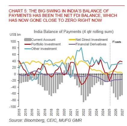 The net FDI balance – which used to contribute around 40 billion dollars annualised a few years ago – has slipped to essentially zero on a four-quarter rolling basis. On the same chart, the current account is moving deeper into deficit at the same time. That combination – a wider current account deficit and a thinner cushion from direct investment – is exactly why India’s external accounts look “unbalanced” into 2026 and why there could be a modestly weaker rupee.