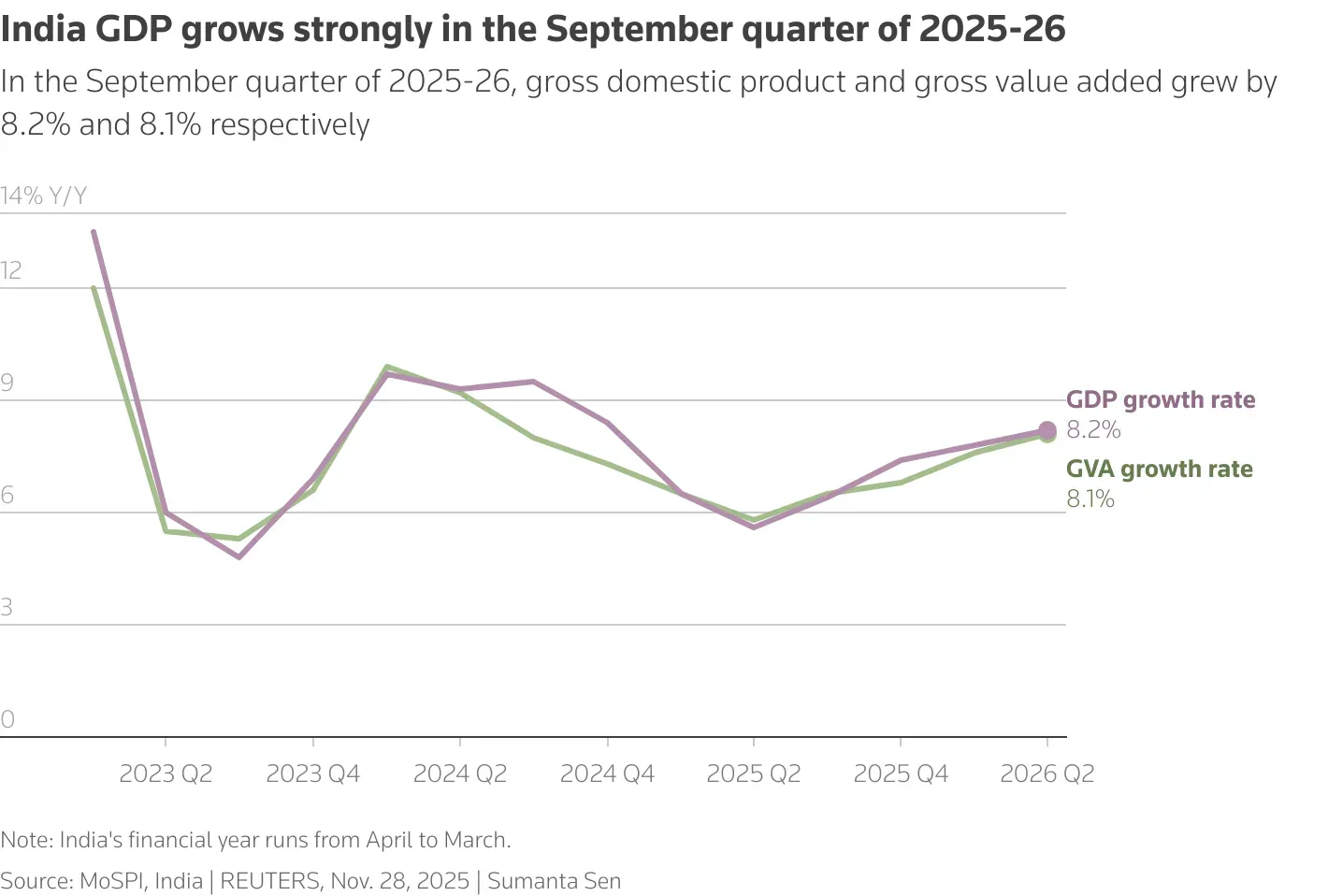 The broader backdrop is actually one of strong growth with manageable external stress. Real GDP grew 8.2% in the September quarter for FY26 , one of the fastest rates among major economies.
