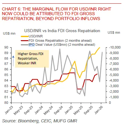 As repatriation rises and IPOs give foreign investors opportunities to exit, the rupee weakens with a lag of a couple of months. The “marginal flow” driving USD/INR at the moment may be more about FDI profit-taking than about shifts in foreign portfolio flows. Whether this drying up of net capital is structural or cyclical remains an open question, but India’s balance of payments remains under modest pressure even after assuming a trade deal and some improvement in portfolio inflows.
