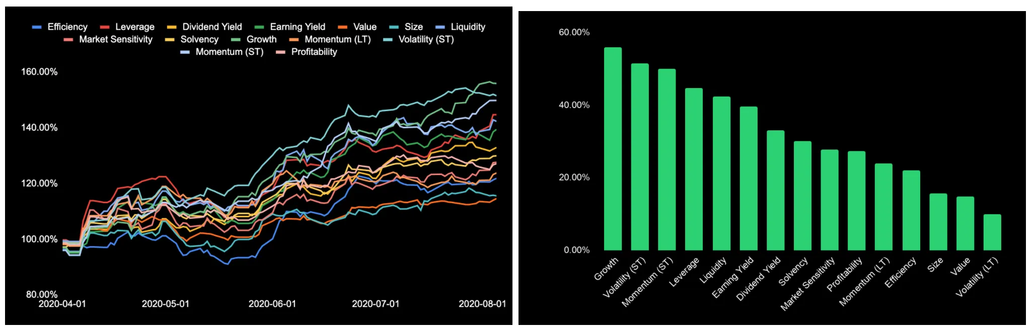 Equity factors are the building blocks of our portfolios (read more about factors here ). We saw that the Growth factor has had the steepest run in the recovery since April followed by short term momentum & low volatility factors.
